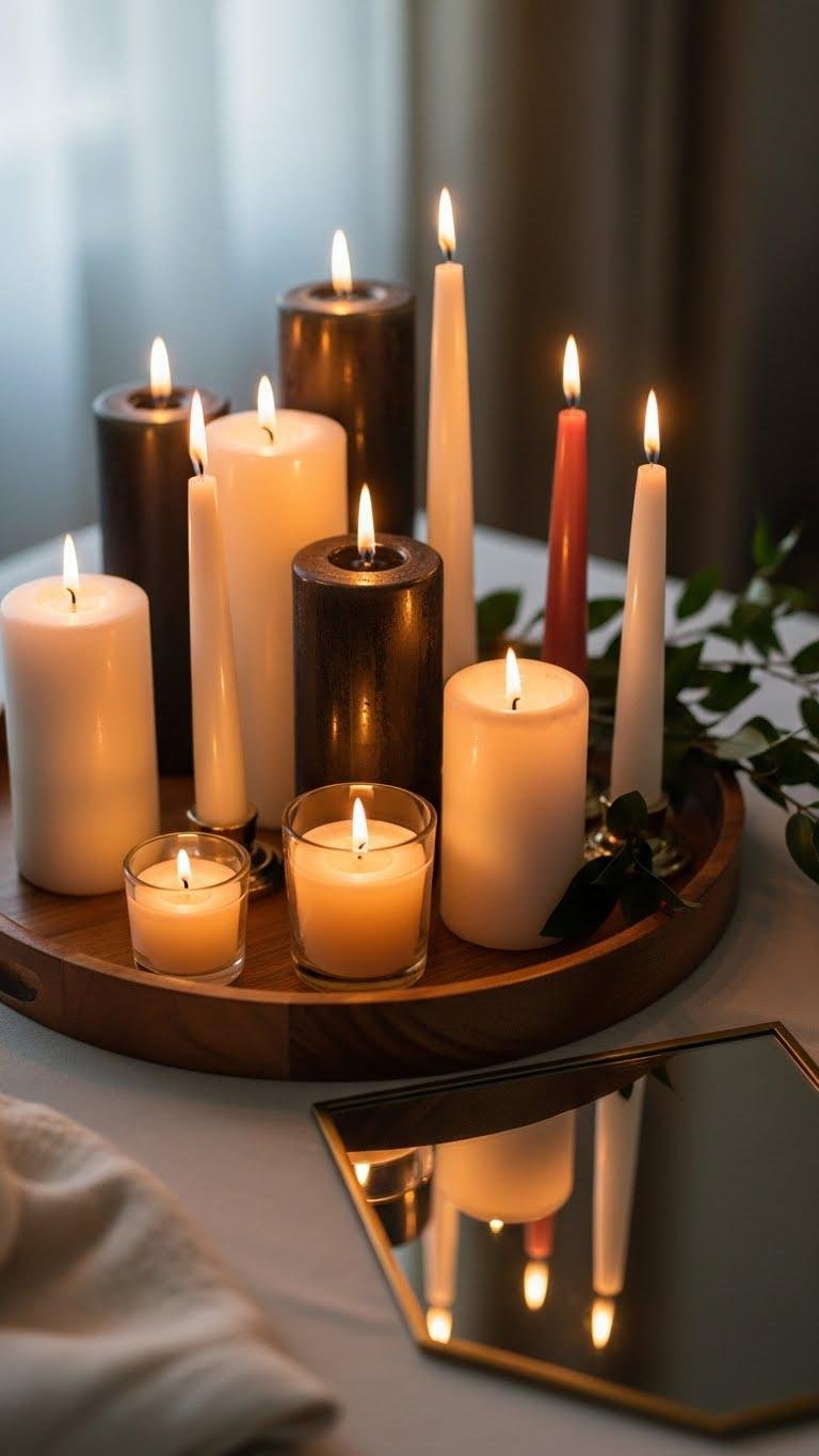 Gather a mix of tapered and votive candles on a warm wood tray to create an intimate, layered centerpiece that feels both modern and deliberately collected. You’ll group varying heights, mix scented wax tones, and leave negative space so each flame breathes. Position near a small mirror for subtle mirror reflection, add a sprig of greenery, and let the arrangement feel unconfined and effortlessly chic.