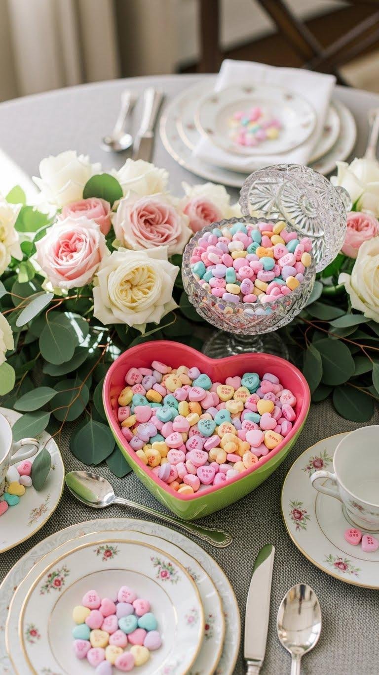After you’ve set the scene with airy eucalyptus and pale roses, introduce a playful note with a Conversation Heart bowl—its pastel hues and cheeky messages bring a wink to the refined vignette. Place a vintage candy bowl nearby, pile tiny hearts inside, and float the bowl among mismatched saucers for curated imperfection. You’ll create a liberated, stylish focal point that feels effortless.