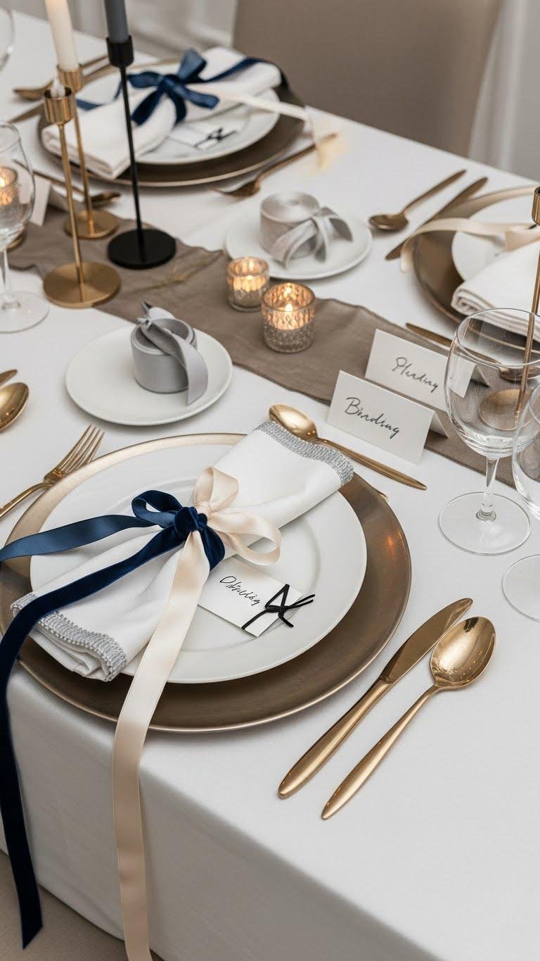 You’ll weave silk ribbon with inventive knot styles, add metallic accents and tasteful ribbon trims, and arrange minimalist place cards so each setting feels liberated and effortlessly chic.