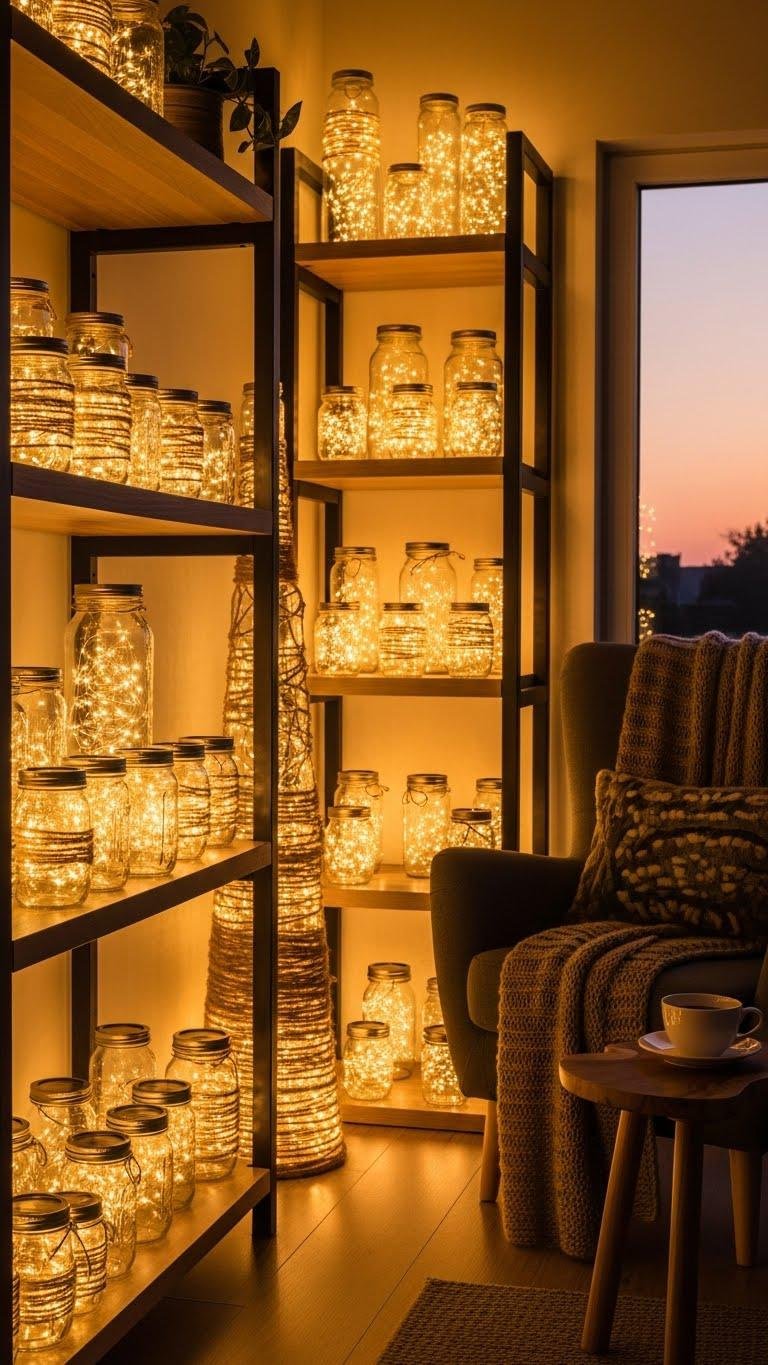 Twinkle a strand of warm fairy lights into a mason jar and you’ll instantly turn ordinary shelving into a soft, romantic vignette that reads both modern and handcrafted.