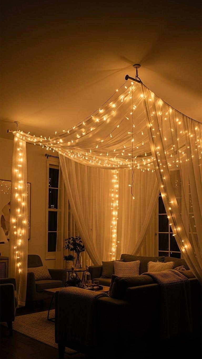 Drape a soft canopy of string lights across your living room ceiling to instantly turn the space into a cozy, star-lit retreat; the delicate glow creates depth without overpowering your décor.