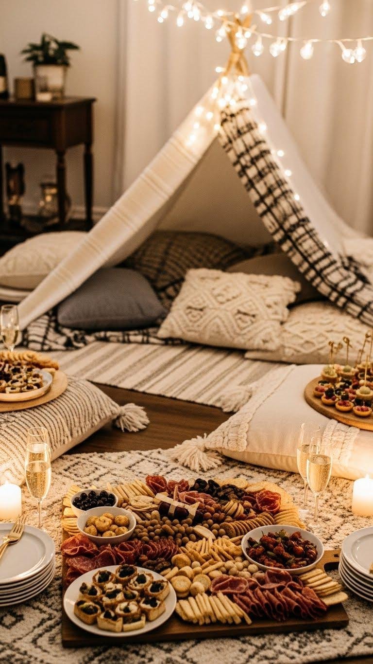 Bring your living room to life with an indoor picnic that combines twinkling fairy lights, low-profile rugs, and a spread of elegant finger foods—it’s an intimate, low-fuss way to celebrate without leaving home.