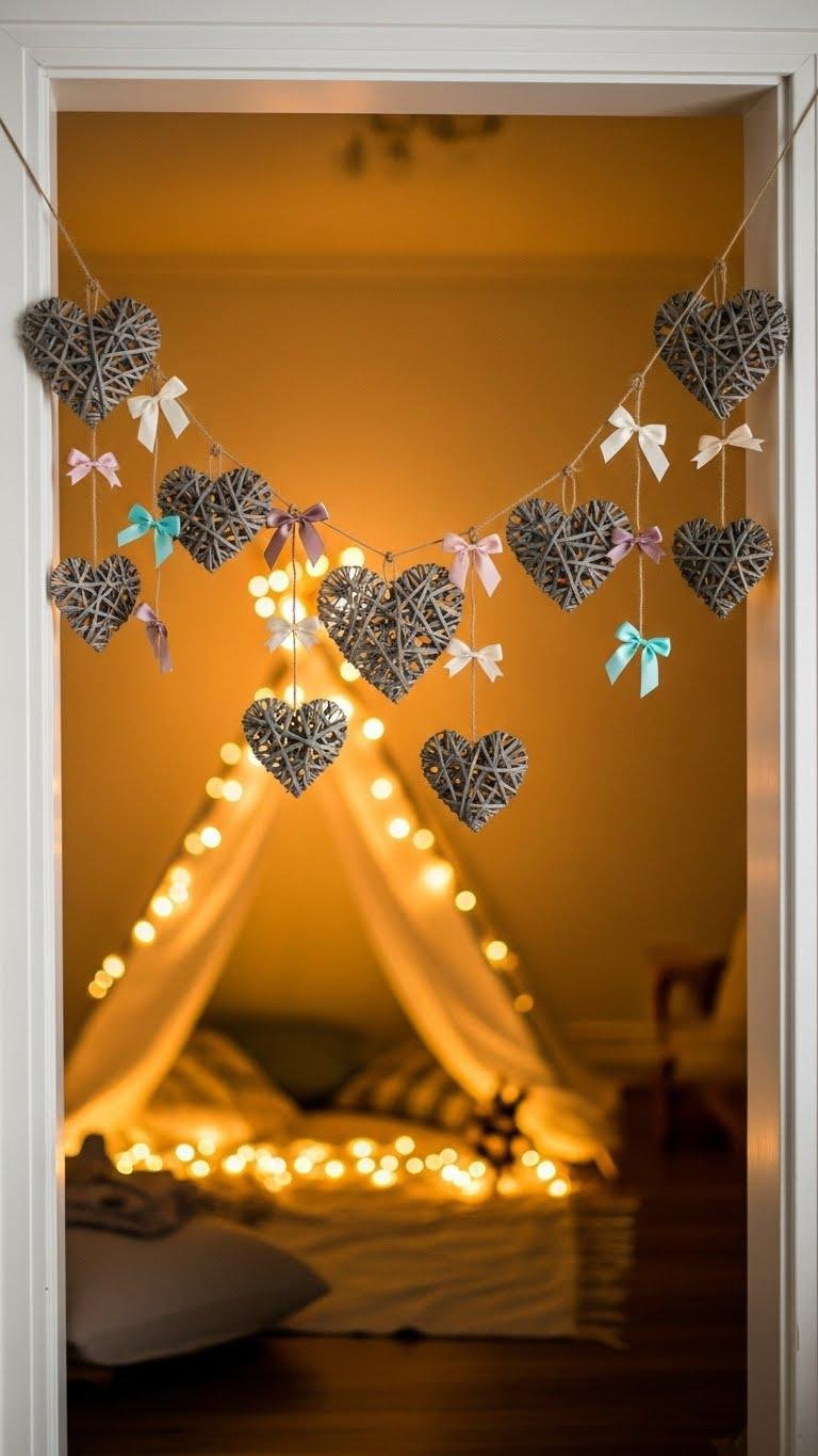 You can carry the intimate, twinkling energy of your indoor picnic into a handmade grapevine heart garland that frames doorways, mantels, or the blanket fort itself.