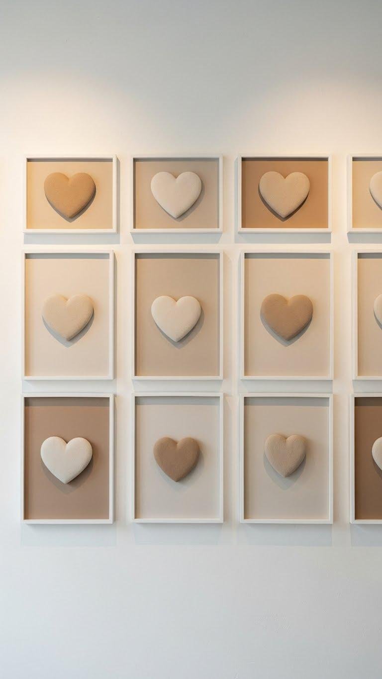 You’ll choose neutral hearts in sand, oatmeal, and clay tones, pair them with gallery-style spacing, and mount minimalist wallart on matte frames.