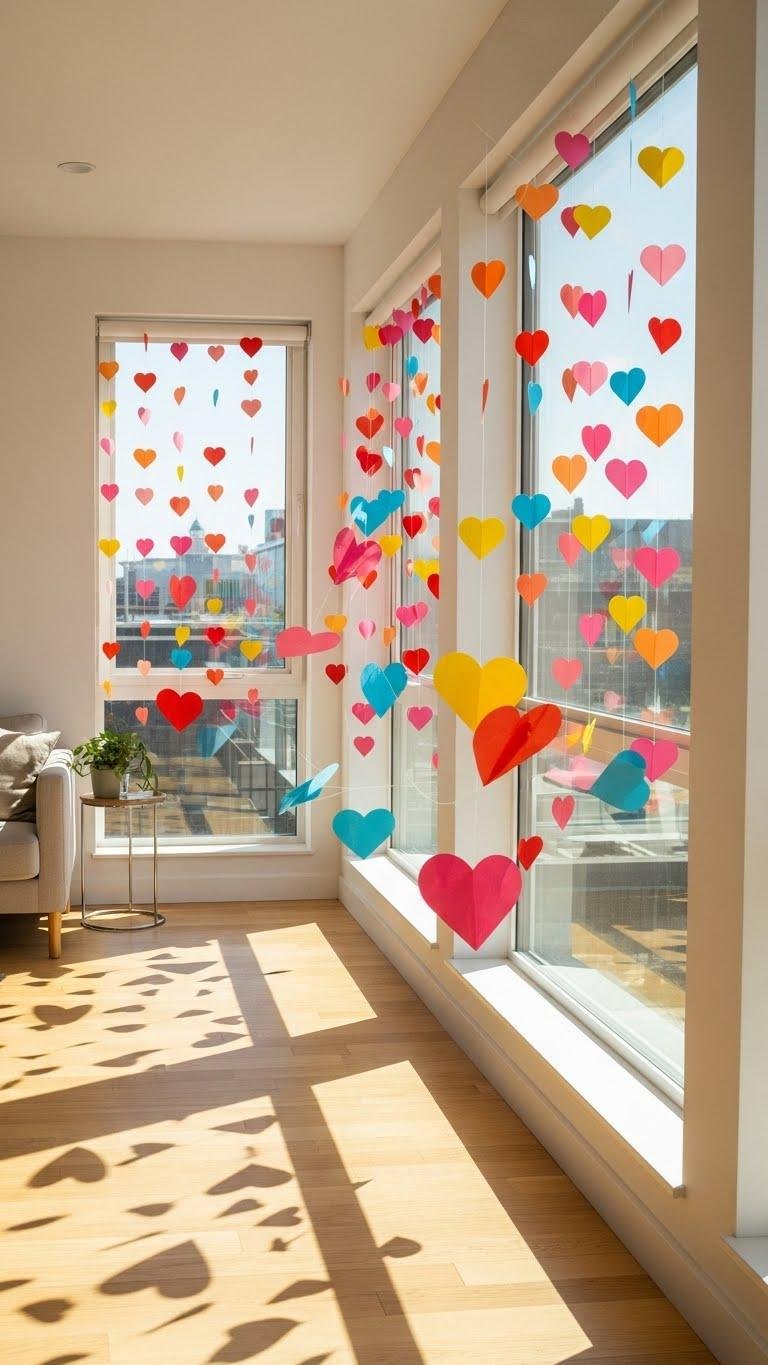 Cut out a mix of sizes from colored or textured paper and string them across your windows to turn sunlight into a soft shower of hearts. You’ll craft stained glass vibes with simple paper cutouts, arranging translucence for playful light filtering.