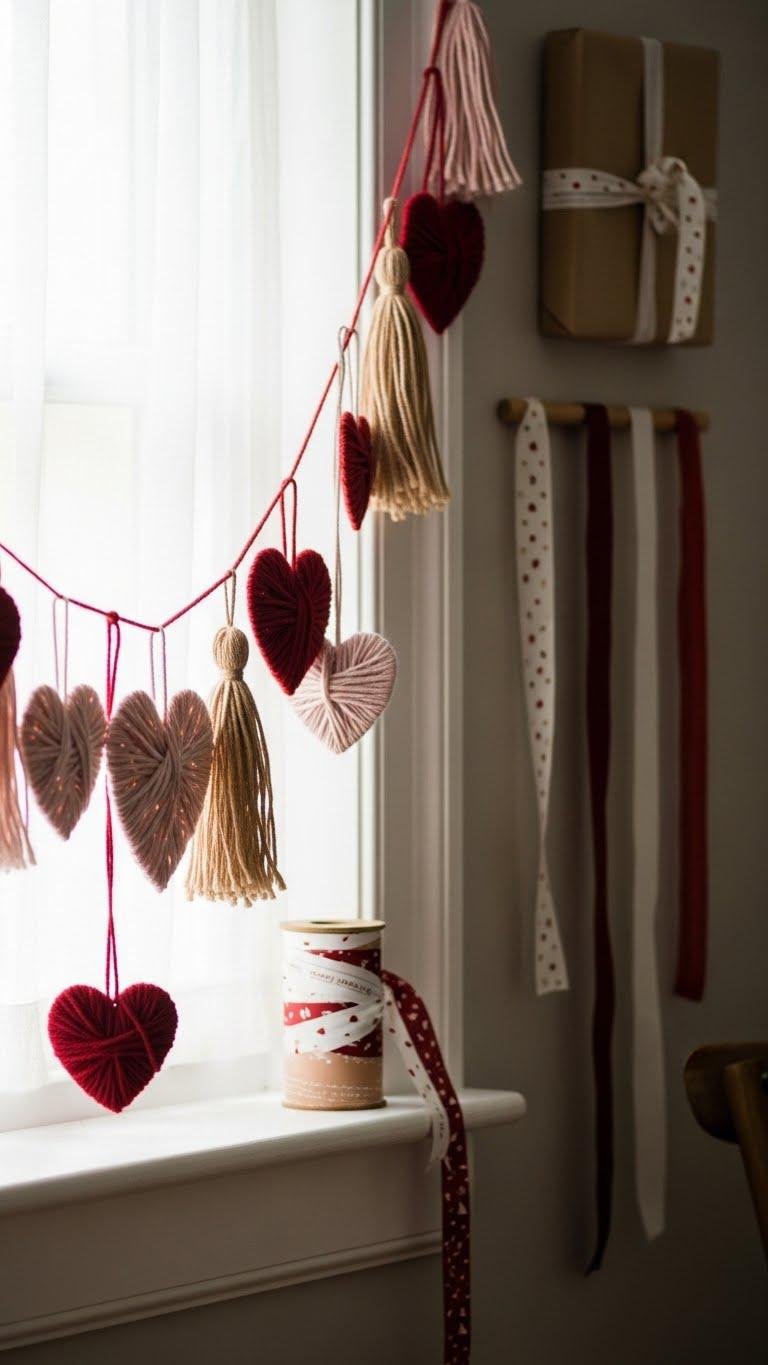 You can keep the handmade vibe going with a yarn hearts garland that brings texture and warmth to your windows or mantel. String mixed yarn hearts in muted reds and blushes, alternating with rustic tassels for movement. You’ll love pairing it with handmade giftwrap accents and minimalist ribbon. It’s a liberated, cozy statement—easy to make, endlessly adjustable, effortlessly chic.