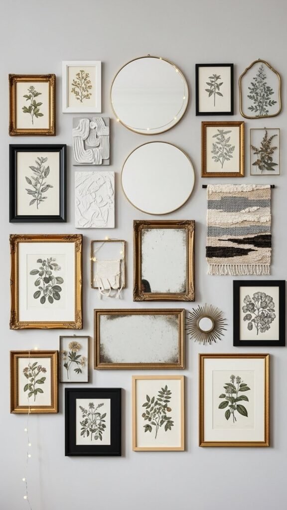 Mix a framed botanical print with textured art, add layered mirrors for depth, and vary frame sizes and spacing. Trust your eye, break symmetrical rules, and prioritize pieces that reflect your taste—bold, personal, and effortlessly free.