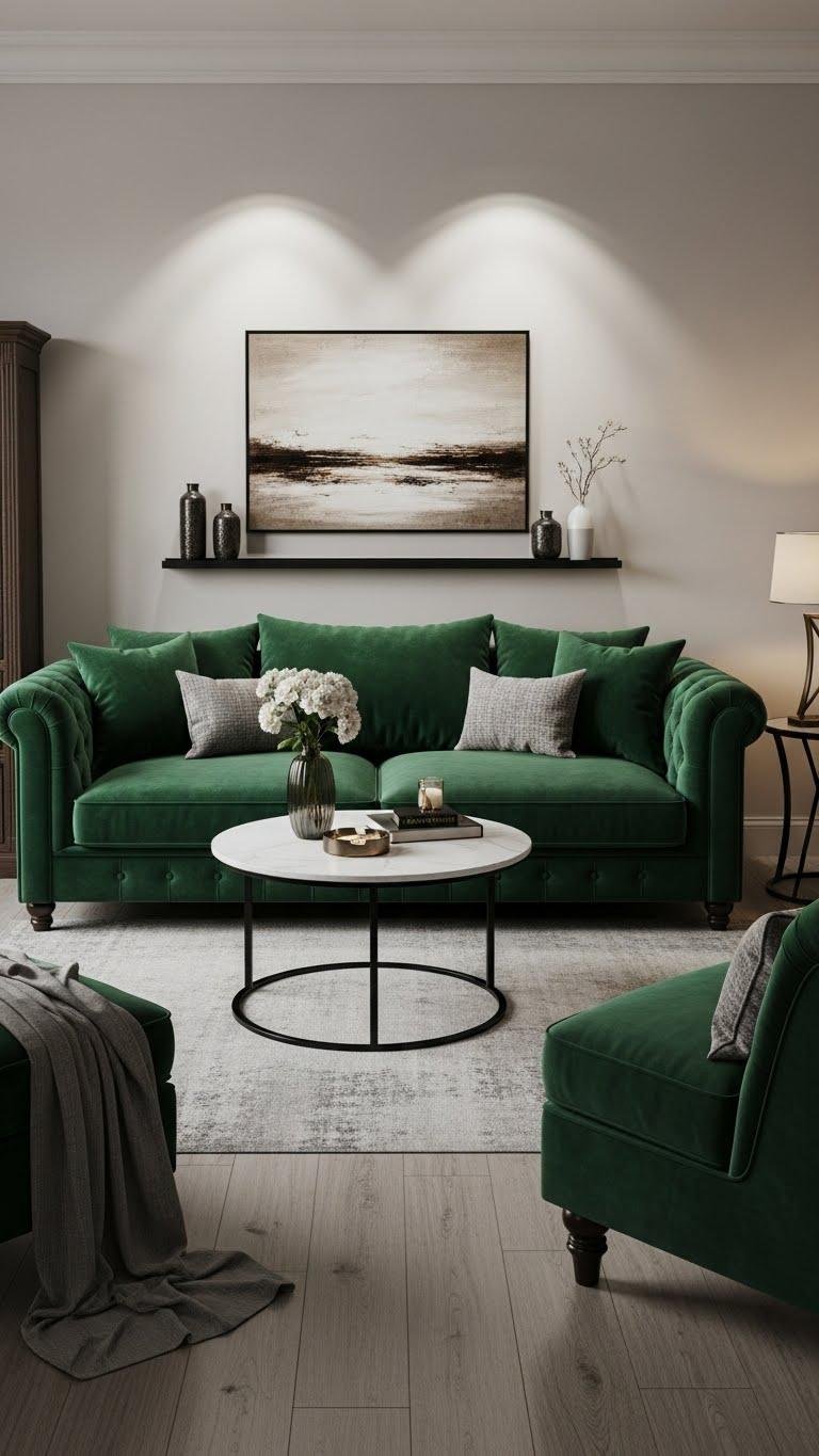 Often, you’ll find a jewel-toned sofa instantly anchors a room, giving it depth and personality without fuss. You’ll choose bold hues that feel liberated, using velvet contrast to add richness.