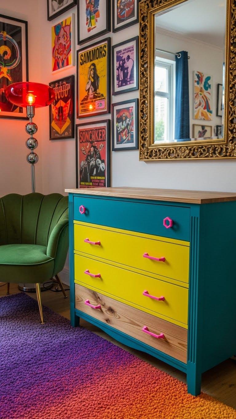 Swap dated pulls for neon hardware, rehang drawers, and stage the finished piece to reflect your liberated aesthetic — bold, personal, and unapologetic.