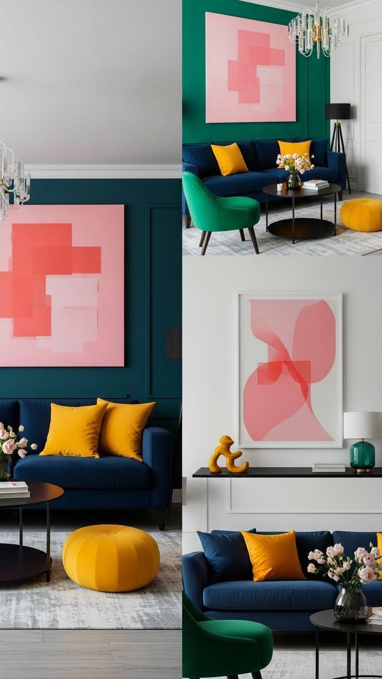You’ll bring instant energy to a room by pairing high-contrast colors—think deep navy with crisp saffron, or emerald with blush—to define focal points and sharpen shapes.