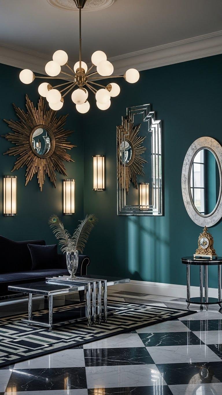 Choose sculptural lighting to carve space with shadow and form, and hang Art deco mirrors to multiply angles and glamour.