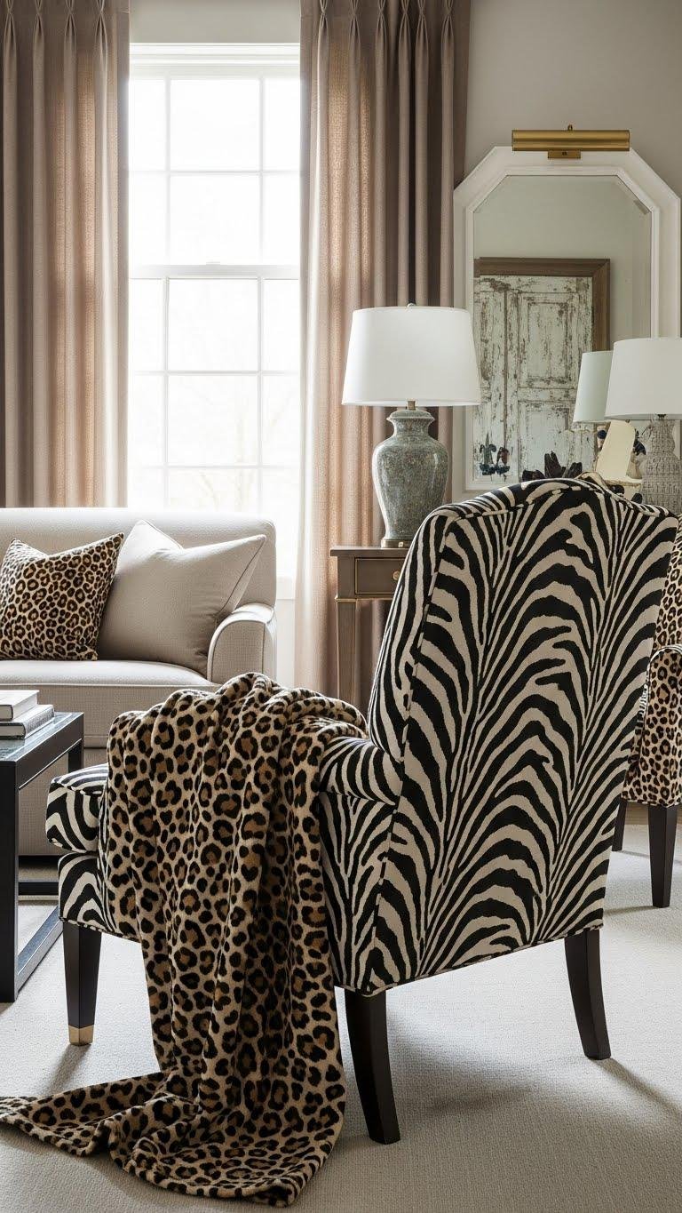 Layer in animal prints to spark energy against the restraint of traditional upholstery, and do it with purpose: pick one dominant print—like a leopard throw or zebra accent chair—and let classic silhouettes and tailored fabrics play the supporting role.