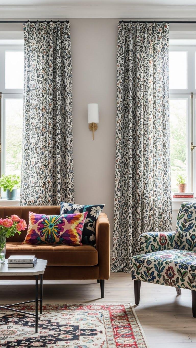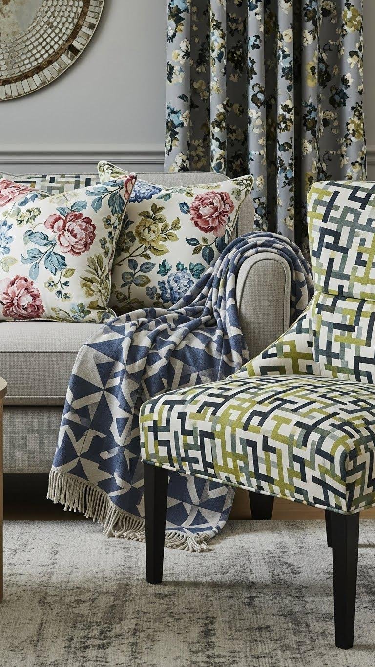 Pairing floral and geometric fabrics releases a dynamic balance—florals soften, geometrics anchor—and you can steer that contrast to suit any room. You’ll explore botanical geometry by mixing scaled blossoms with crisp grids, using color to unify. Embrace pattern juxtaposition confidently: layer pillows, drape a throw, or upholster a chair so each piece reads bold, personal, and free without clutter.