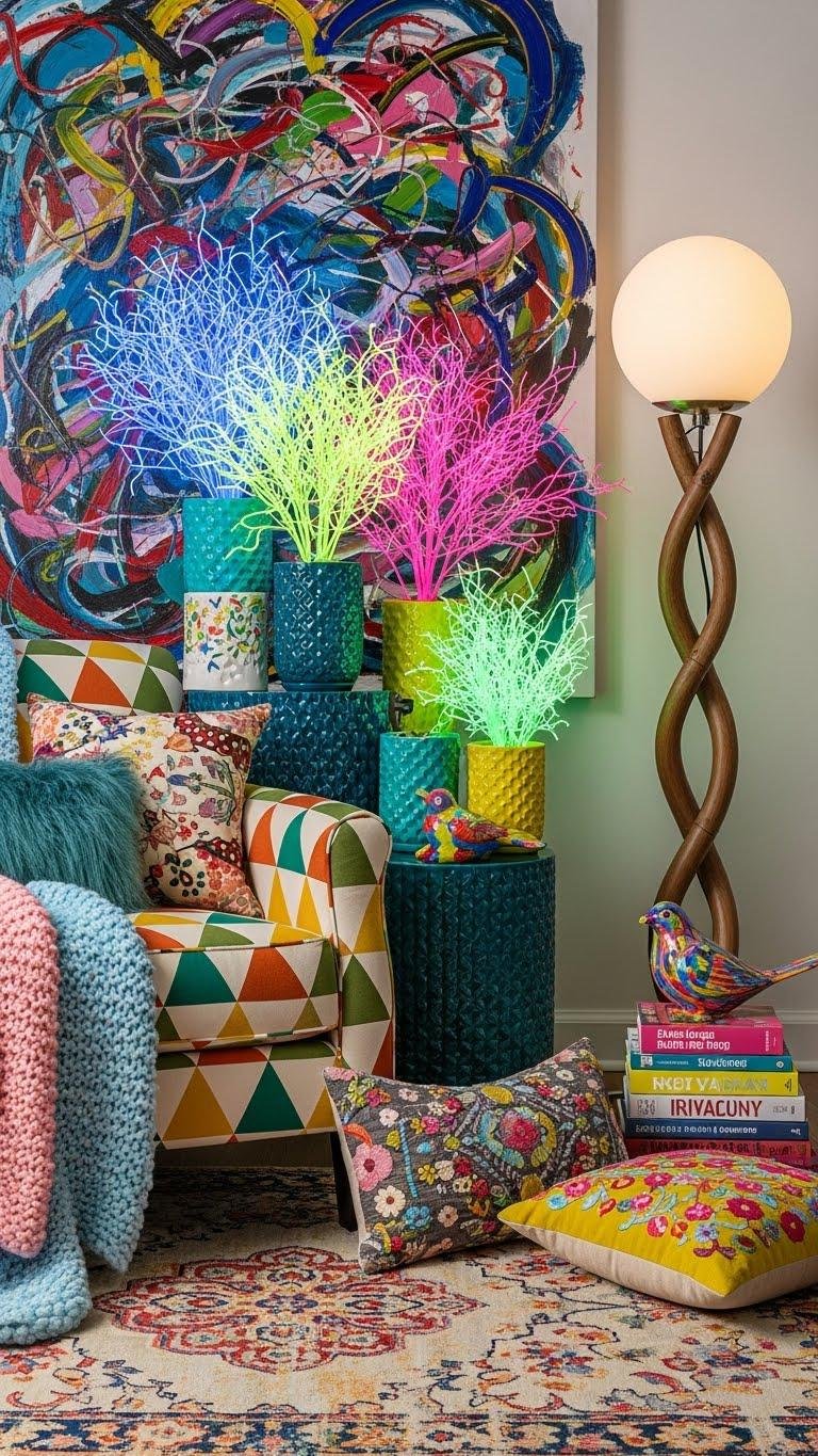 Often you’ll want a small, intentional zone that sparks joy the minute you walk in — a Dopamine Decor Corner uses bold color, tactile surfaces, and a mix of unexpected objects to lift your mood without shouting.