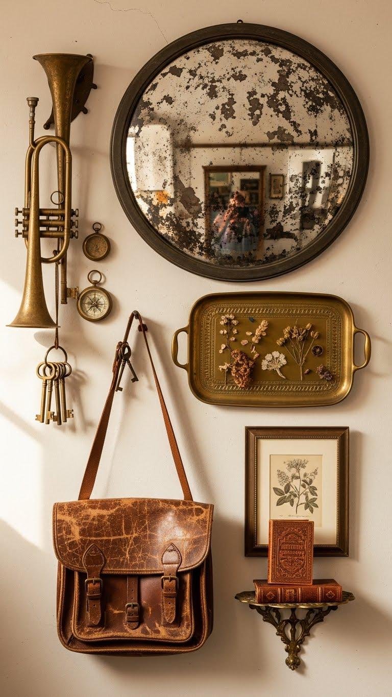 You’ll choose pieces with patina storytelling—worn brass, faded leather, or a weathered mirror—that carry history and freedom.