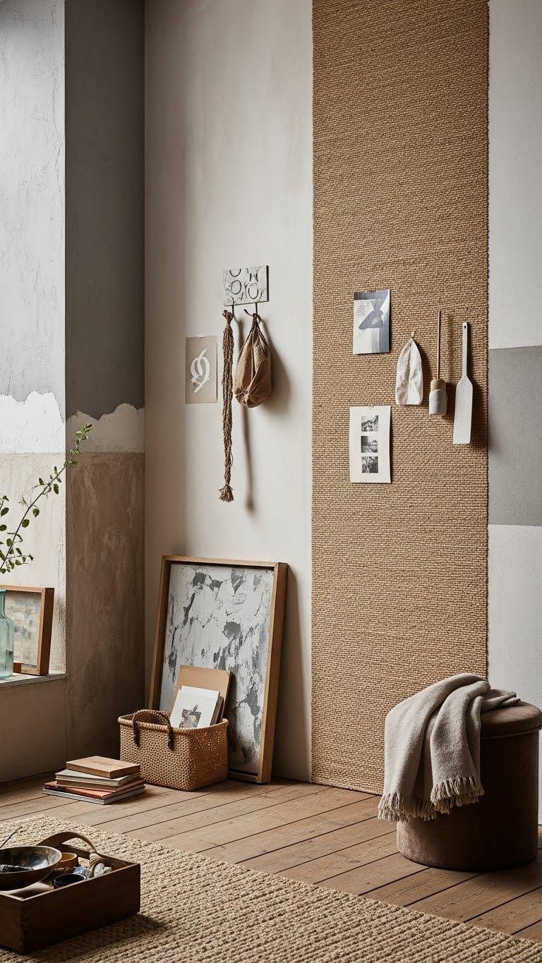 Embrace tactile plasterwork for sculptural warmth or layered paint effects, and install woven grasscloth to introduce organic pattern and movement. You’ll mix finishes confidently—matte, satin, rough—letting walls speak boldly while still leaving space for personal artifacts and free-spirited styling.