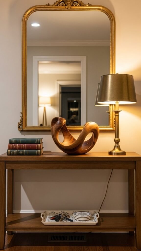 Once your mirror vignette has set the tone, layer a console table beneath it to carry that look down to eye level and into daily use.