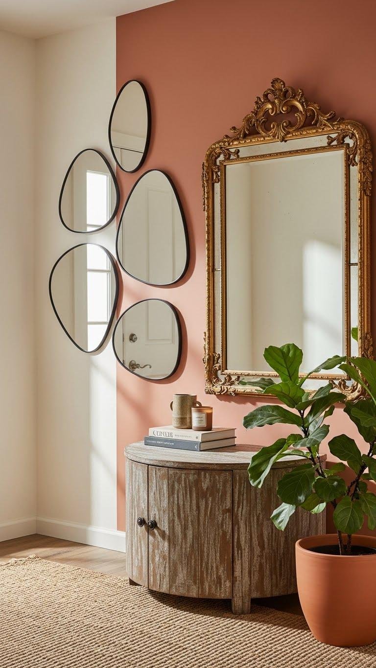 Choose an antique frame for history-rich contrast or assemble a mirrored cluster for modern depth. You’ll place mirrors to reflect light, define traffic flow, and express a free-spirited aesthetic.