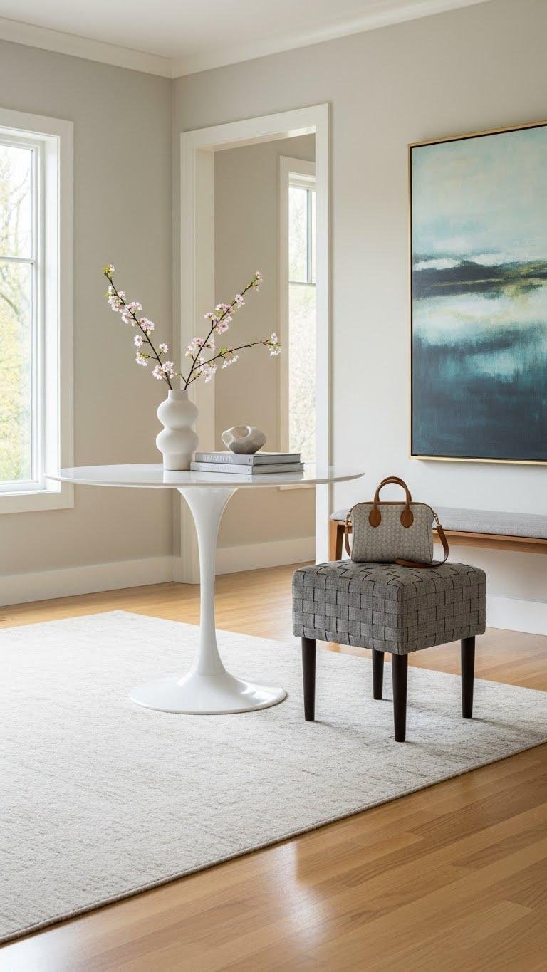 Anchor your entryway with a tulip table or small ottoman to add both function and sculptural interest without crowding the space.