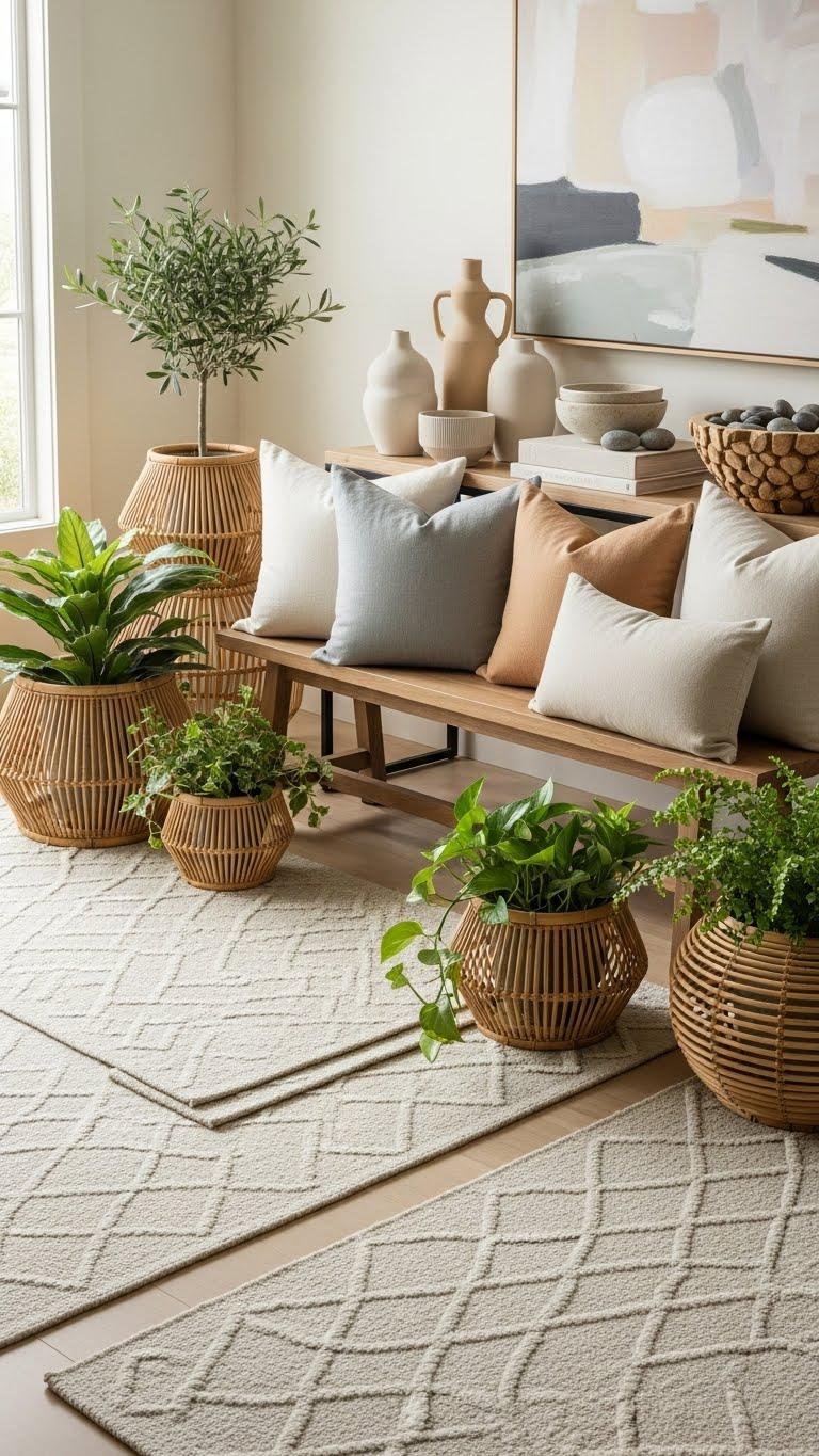 Layer wool, linen, and rattan to create an entryway that feels curated and tactile without looking fussy. You’ll anchor the space with textured wool runners, add linen cushions or a simple bench throw for softness, and introduce greenery in sculptural rattan planters.