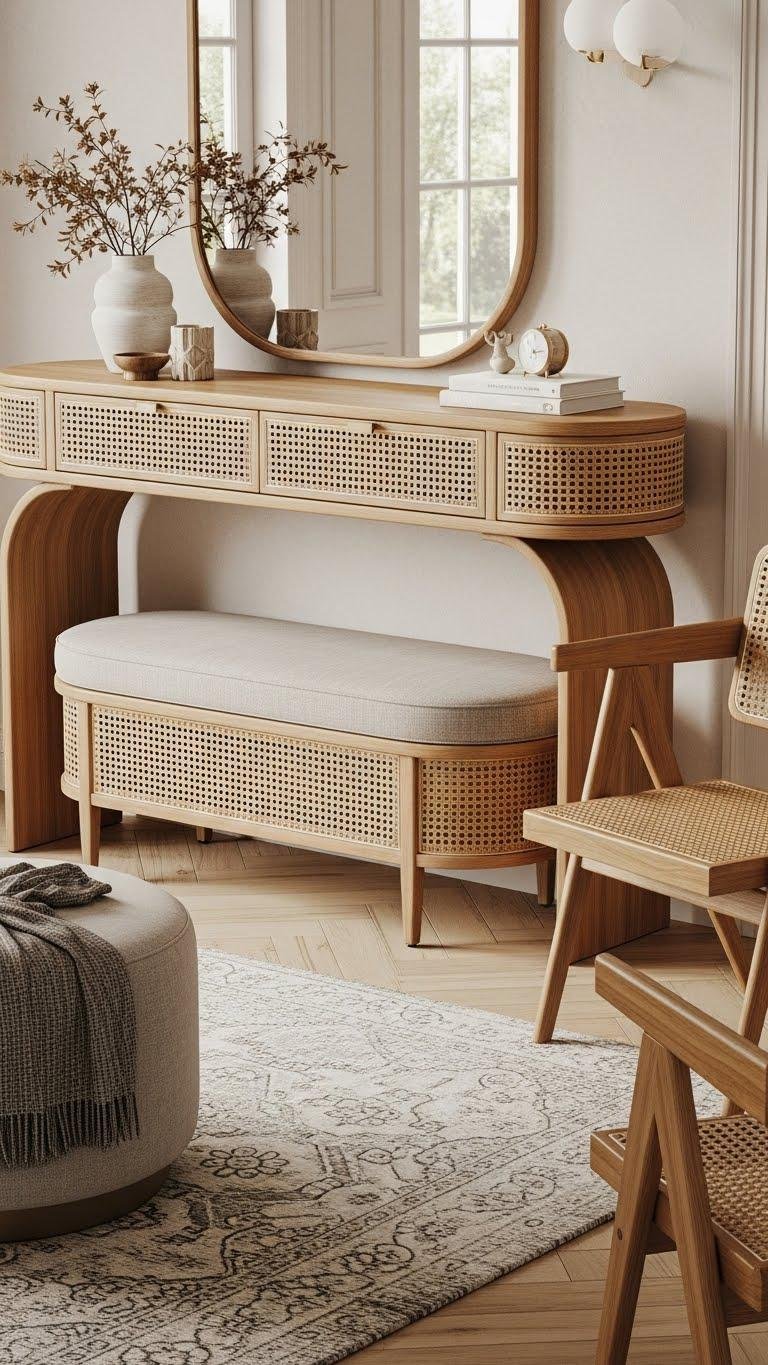 After you’ve built warmth with wool, linen, and rattan, soften the silhouette of your entryway with curved furniture and cane accents that bring a vintage-modern balance. You’ll choose pieces with gentle curved silhouettes—a rounded bench, console with arched legs—and subtle cane detailing on drawer fronts or chair backs to introduce texture, lightness, and effortless movement that supports a liberated, collected sense of home.