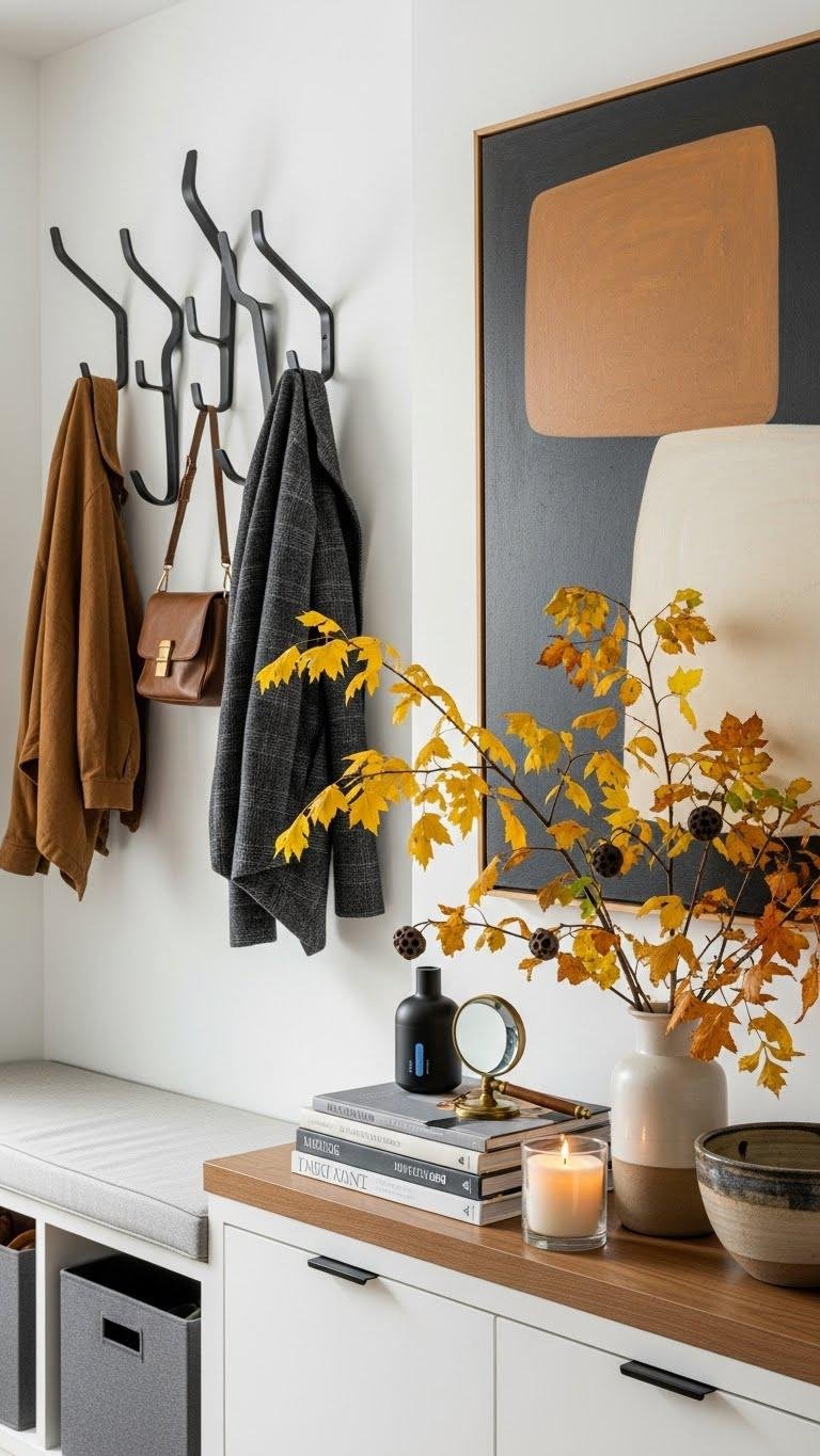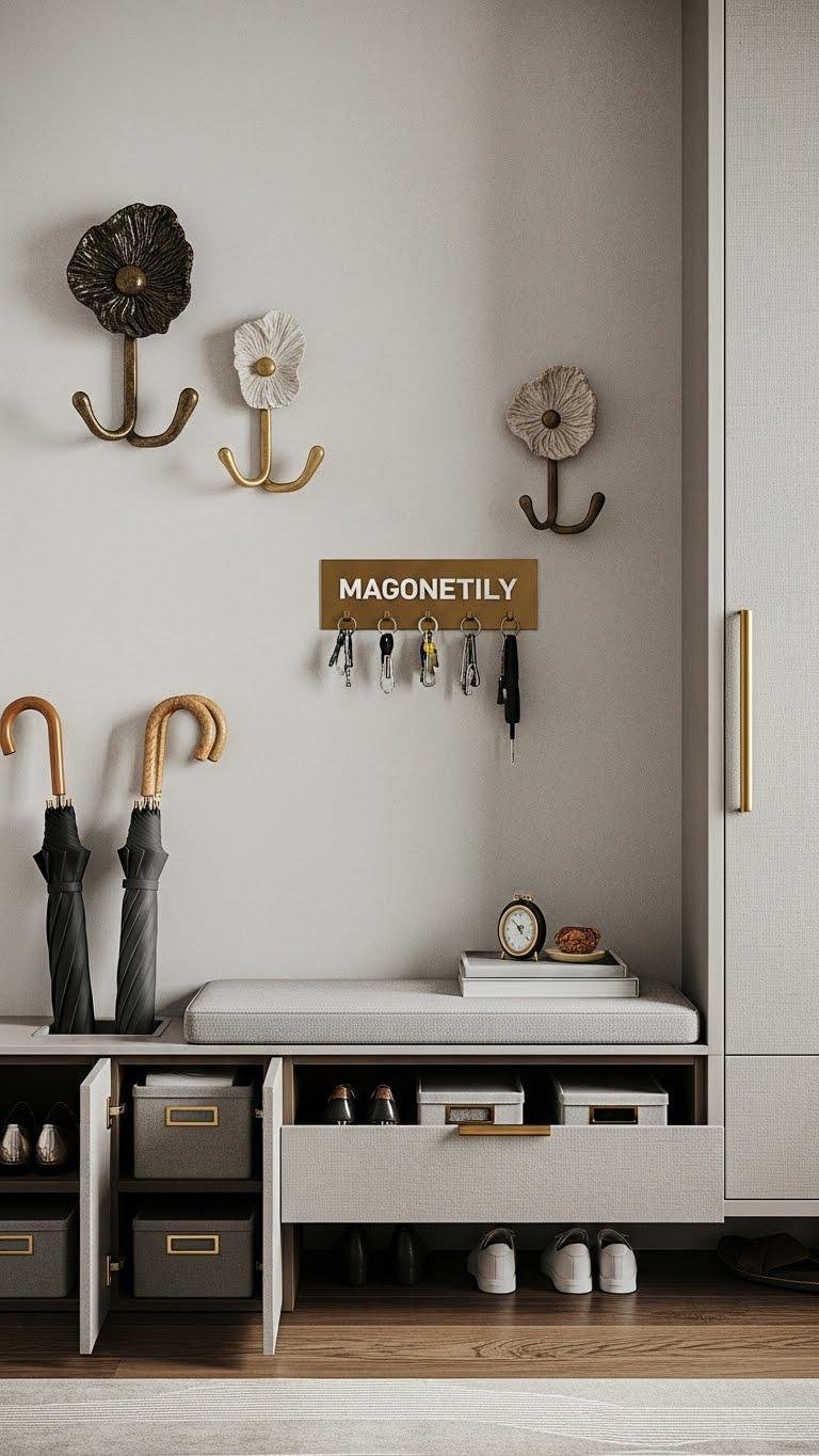 When you pair sculptural hooks with hidden cubbies and slim bench storage, the entry becomes both purposeful and polished.