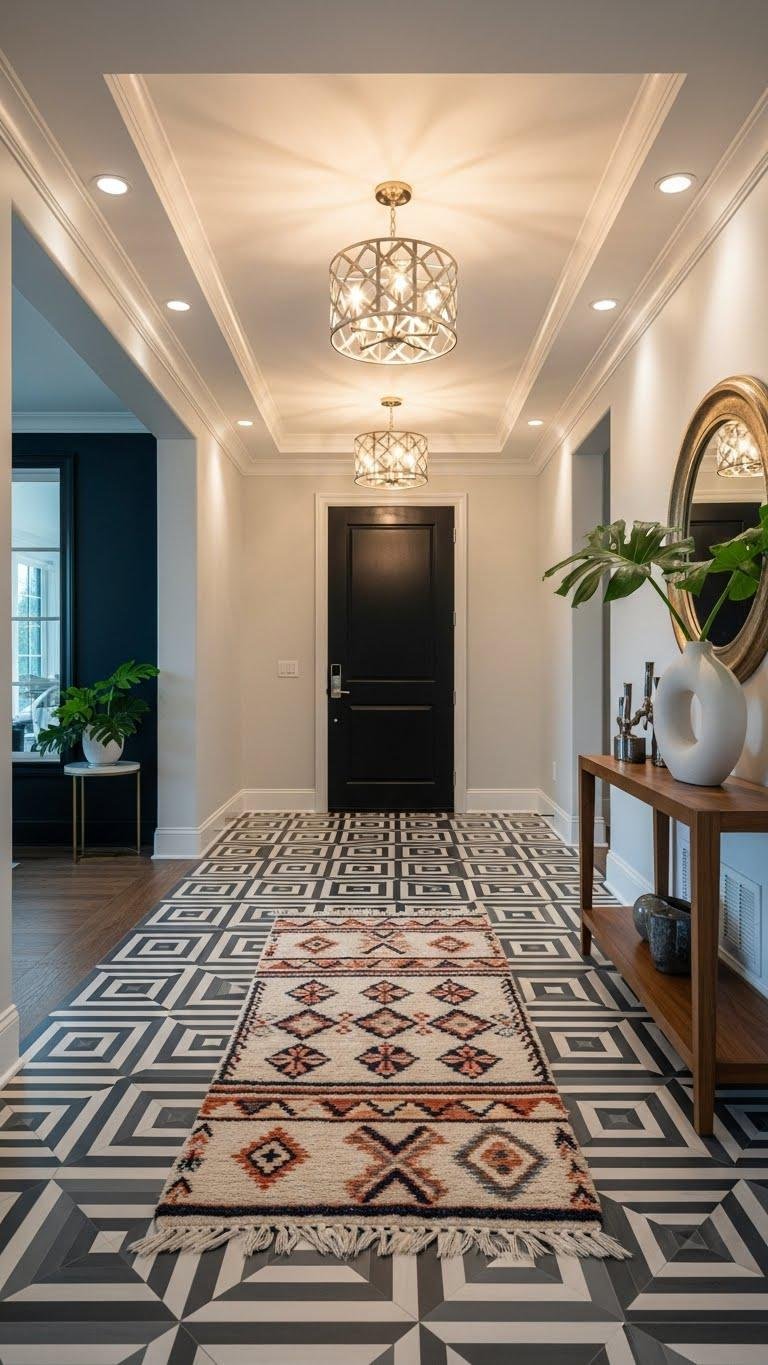 Move the eye from layered lighting down to the floor by choosing patterned tile or a bold rug that anchors the entry and sets the home’s visual mood.