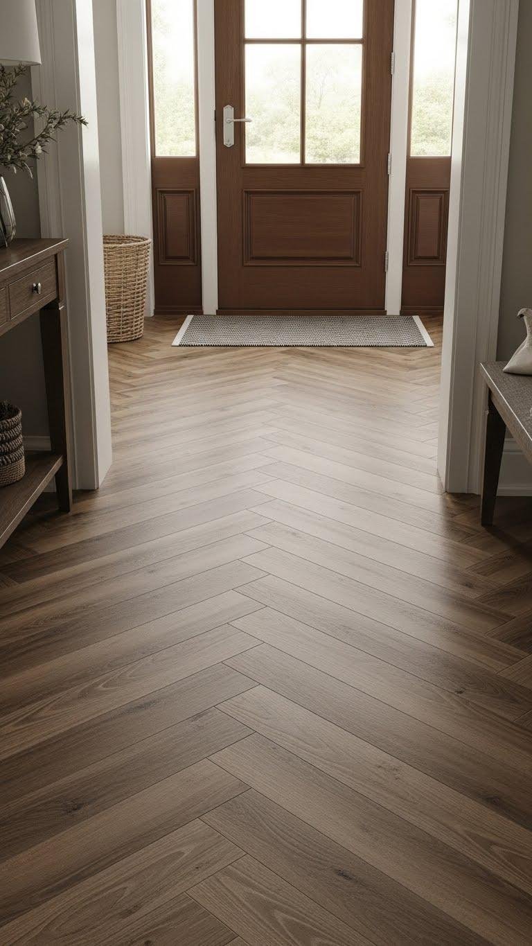 Lay a herringbone wood floor to give your entry instant structure and timeless style—its chevron-like pattern guides the eye inward while adding tactile warmth underfoot. You’ll choose plank width and stain to maximize herringbone pattern impact, balancing woodgrain contrast with a subtle matte finish.
