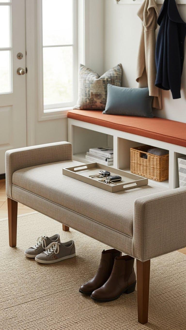 Anchor the entryway with an upholstered bench that invites seating and sets the tone for the space. Choose an upholstered ottoman-style bench with clean lines so you can relax while tying shoes.