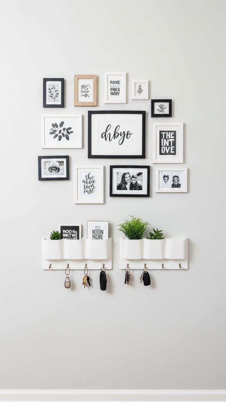 Keep spacing consistent, align a focal cluster at eye level, and add functional pocket shelves for keys or tiny plants. This tidy, on-trend display feels intentional and effortless.