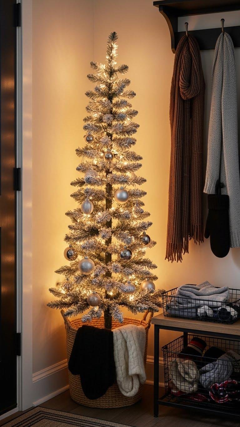 Often tucked into a narrow corner, a cozy flocked tree can instantly set a wintery tone for your entry nook without overwhelming the space.