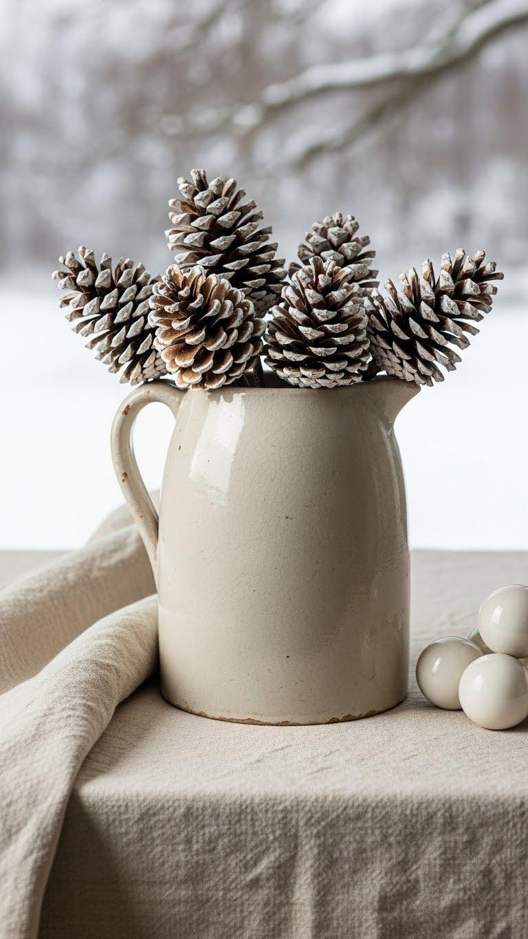 Bring a fresh, wintry touch to your entry by grouping white‑washed pinecones in a vintage jug—it’s an easy, low‑fuss centerpiece that feels both modern and timeless. You’ll place them in an antique jug for instant character, use simple pinecone dyeing to achieve a soft winter patina, and balance glossy ceramics or linens for pleasing texture contrast that still reads effortless and free.