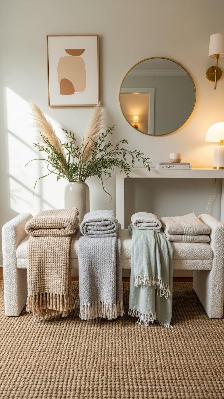 Bring in a boucle bench topped with seasonal throws to make your entry feel instantly curated and snug.