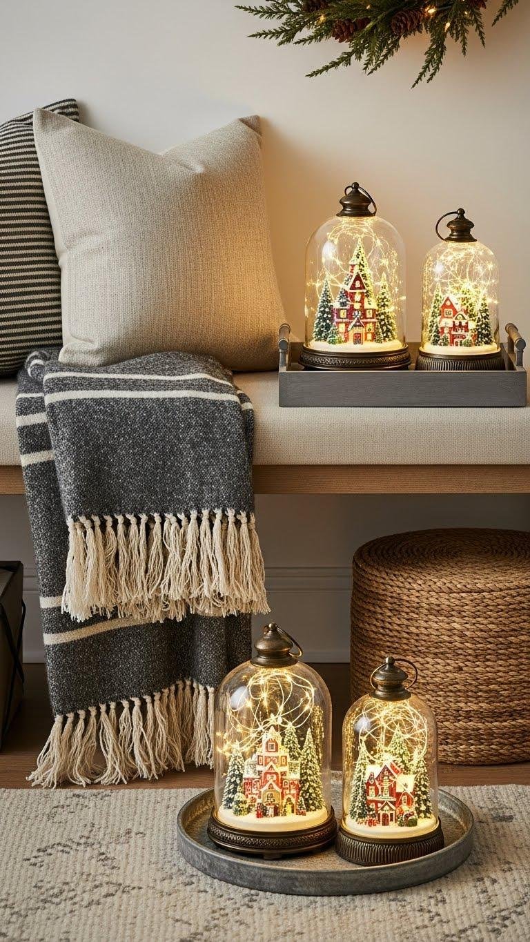 After you’ve made the bench feel lived-in with seasonal throws, anchor the tabletop or console with a snow globe lantern trio arranged on a simple tray to add a playful, luminous focal point. You’ll mix a glass cloche look with a miniature village inside, each on a painted base and subtle LED base lighting. It’s stylish, portable, and effortlessly free-spirited.