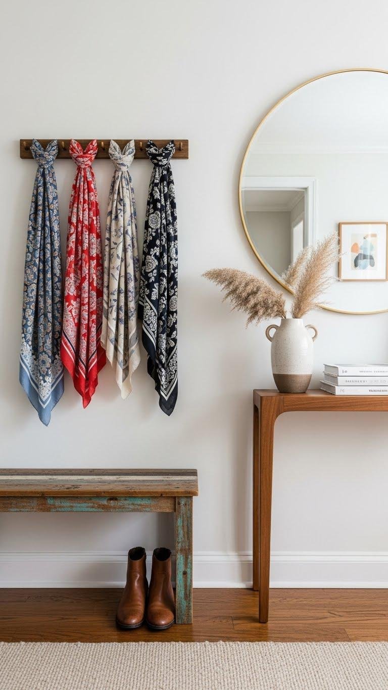 Swap out ordinary coat hooks for a curated display of winter scarves to give your entryway an instant style upgrade. You’ll mix textures and embrace scarf colorblocking—bold neutrals, jewel tones—while mindful hook spacing keeps the look airy and functional. Hang scarves at varied lengths, rotate seasonally, and let each piece feel effortless; it’s a liberated, polished touch that invites guests in.