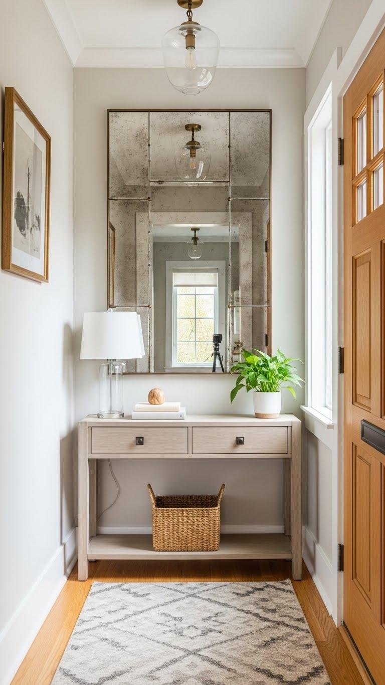 Choose an antique mercury glass wall piece for vintage warmth or an angled floor mirror for effortless scale. Position mirrors opposite windows, keep surrounding decor minimal, and let light liberate the entryway’s energy and flow.