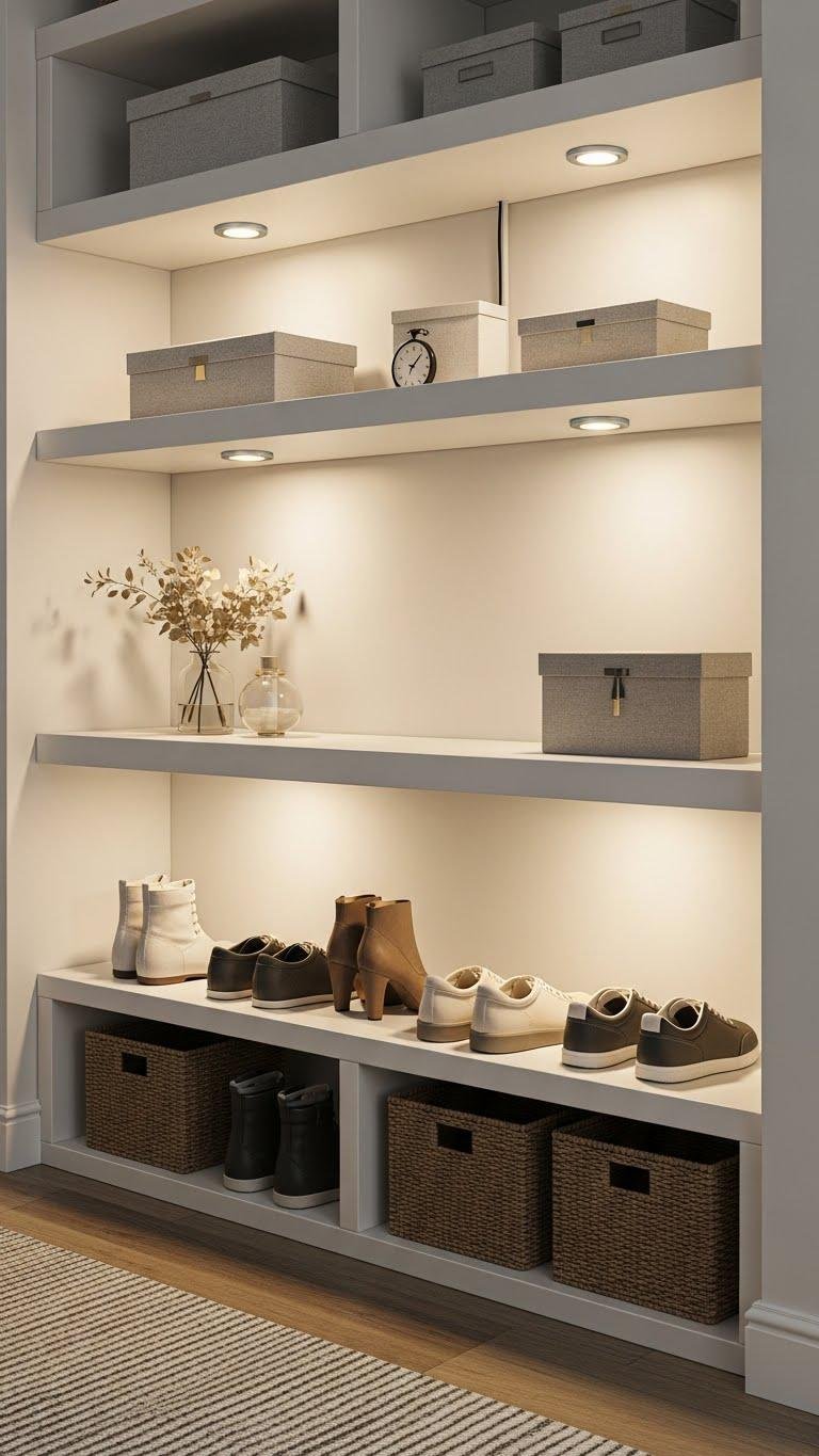 You’ll love recessed pucklights for subtle, even glow; hideaway LEDs keep styling minimal. Install with magnetic mounts and tidy under shelf wiring so lighting feels effortless and liberating, highlighting shoes, baskets, and a clean winter vignette without clutter.