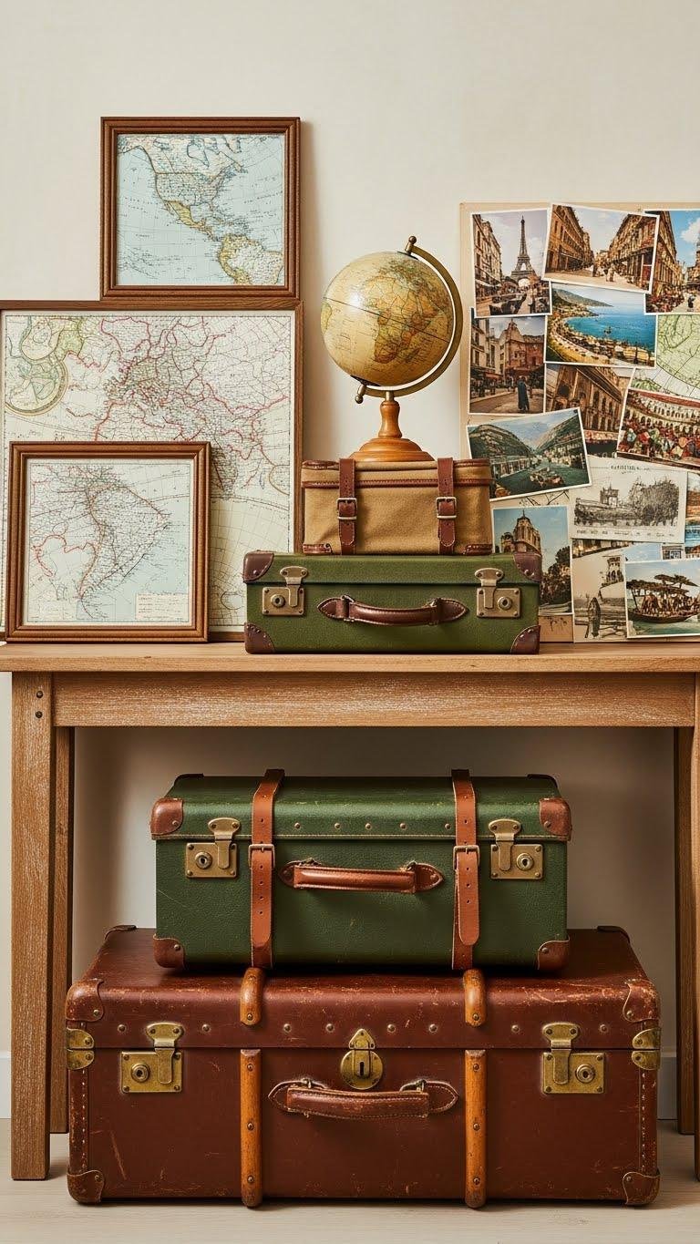 With a few carefully chosen pieces, you can turn a narrow console into a story-rich travel memento vignette that greets guests and sparks conversation. Arrange a low suitcase stack topped with a curated travel trinket, tuck map fragments into frames, and lean a postcard collage against the wall. Keep lines clean, colors cohesive, and let each object signal adventure and effortless freedom.