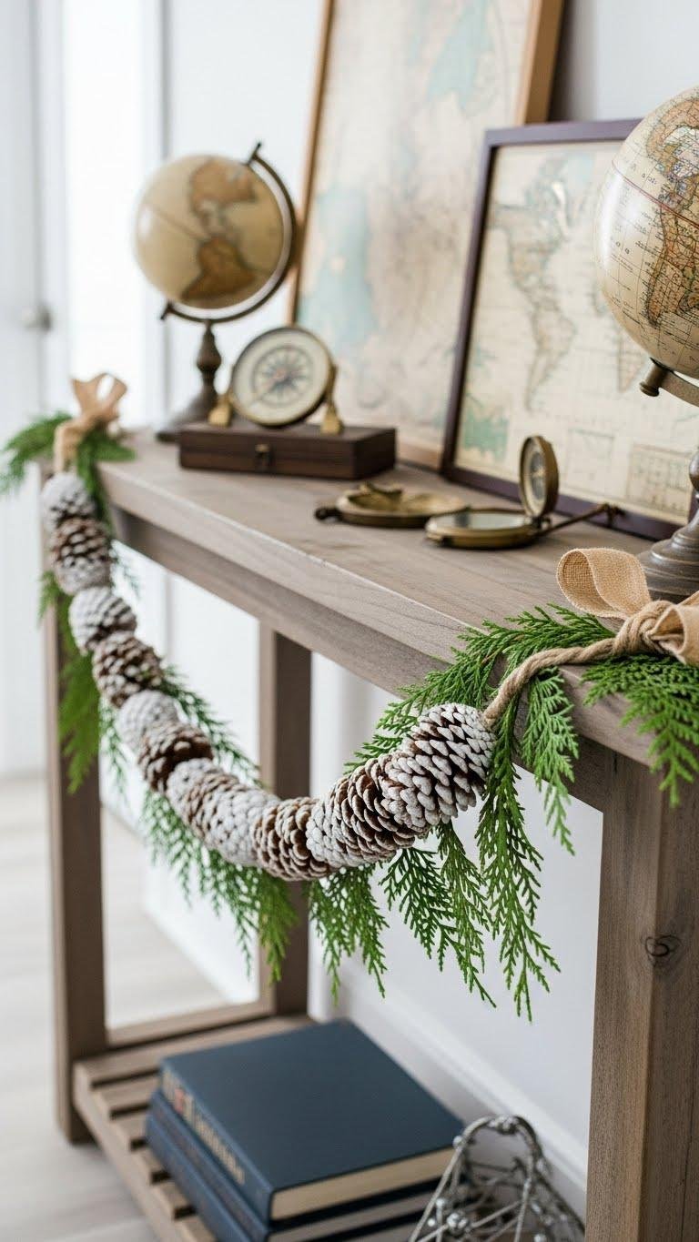 Drape a white pinecone garland along the edge of the console to add winter texture without overwhelming your curated travel vignette.