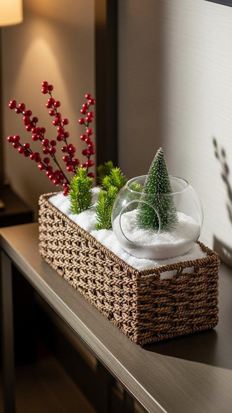 If you want a compact, sculptural accent that still feels seasonal, tuck a narrow basket by the console and fill it with a light dusting of faux snow and sprigs of evergreen.