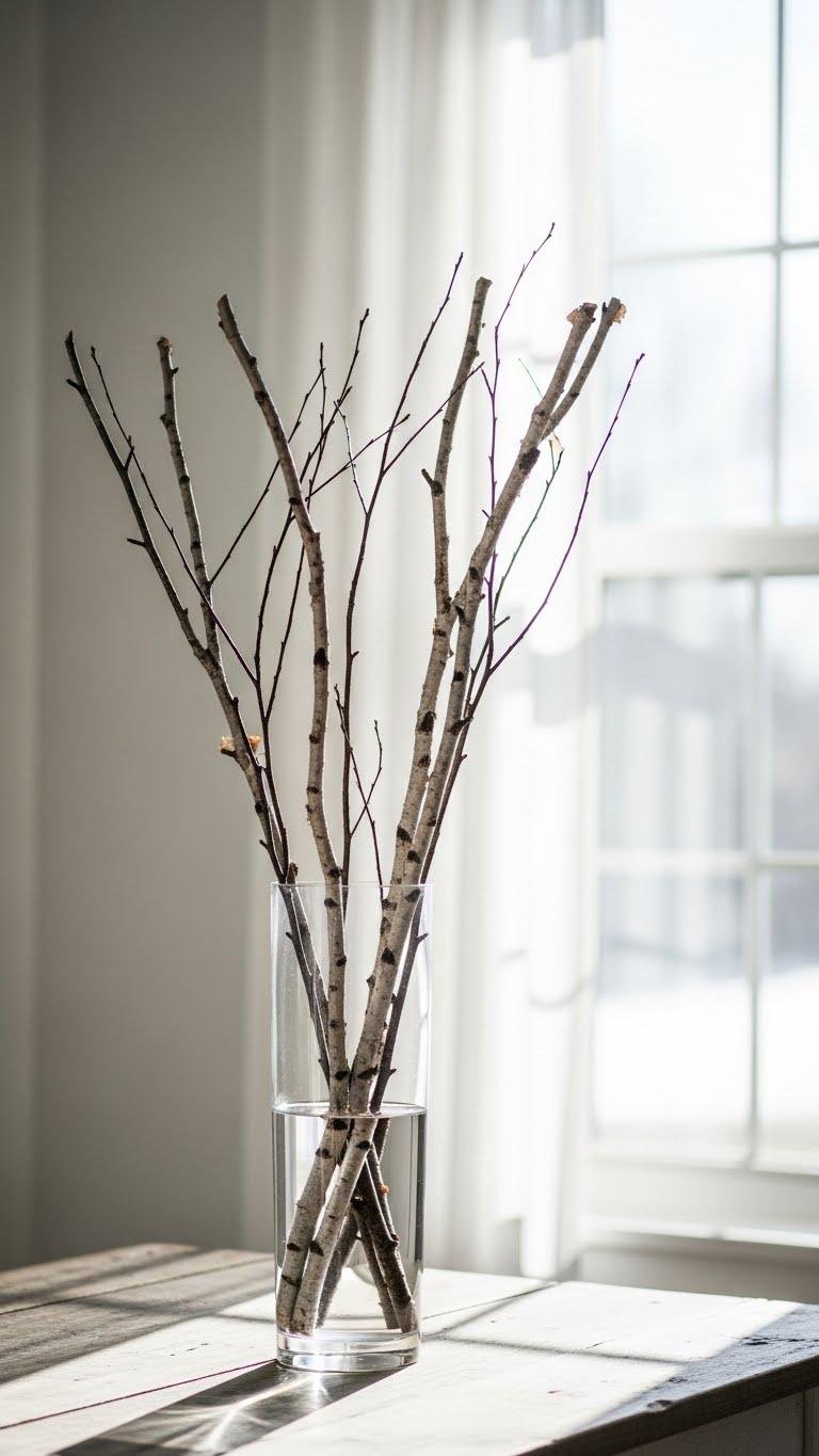 If you liked the effortless charm of white‑washed pinecones in a vintage jug, try a tall vase of birch branches to heighten that same winter calm with vertical drama. You’ll create a striking rustic silhouette that feels both liberated and curated. Keep to minimalist stems, trim for proportion, and place near natural light so the entryway reads airy, sculptural, and confidently simple.