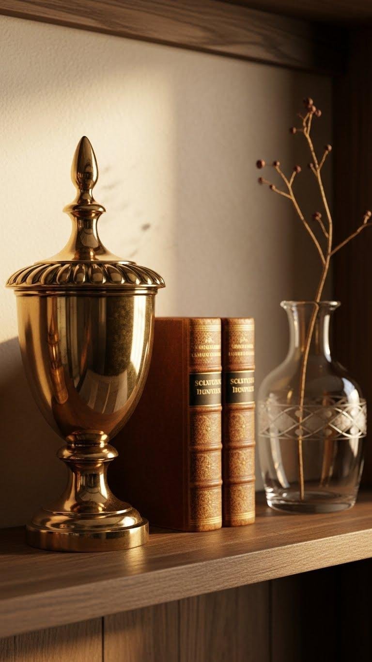 Anchor a shelf display with a polished bronze urn finial to bring instant sculptural warmth to your entryway. You’ll balance scale and antique patina by pairing it with a simple stack of books and a glass vase.