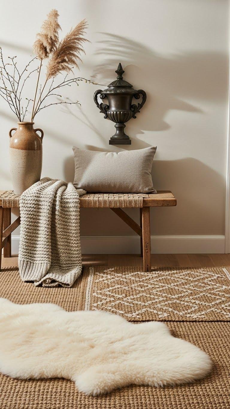 After you’ve set the scene with sculptural accents like a bronze urn finial, layer textiles to make the entryway feel lived-in and welcoming. You’ll mix durable layered runners for traffic with a plush sheepskin to soften a bench or chair, choosing neutral tones and bold texture contrasts. This keeps the space practical, stylish, and effortlessly free-spirited.