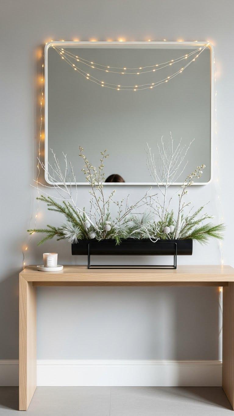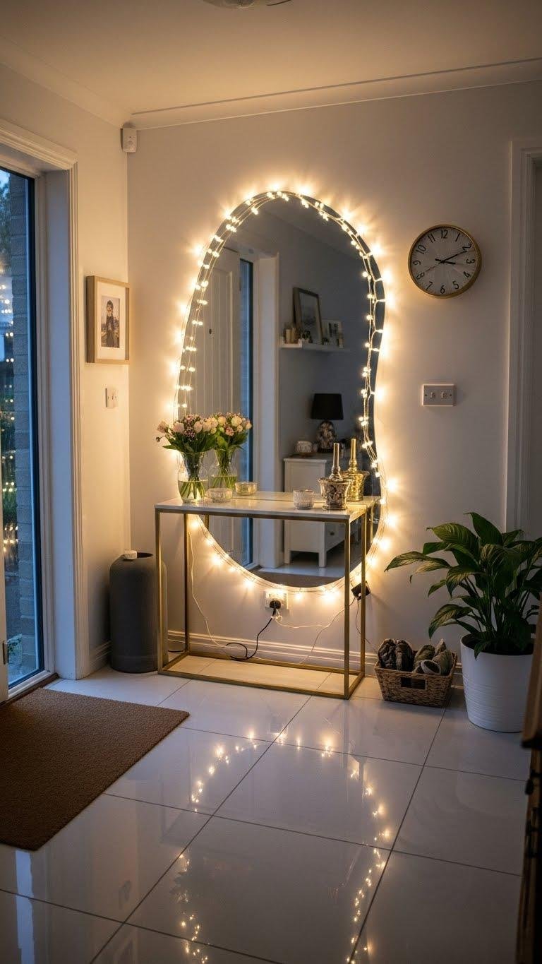 Want to add instant warmth and a hint of magic to your entryway? Drape twinkly lights around a soft mirror to create a subtle, modern vignette. You’ll get a flattering fairy glow that broadens the space and feels effortlessly inviting. Secure lights discreetly, choose warm-white LEDs, and keep cords tidy so the look stays polished, relaxed, and ready for guests.