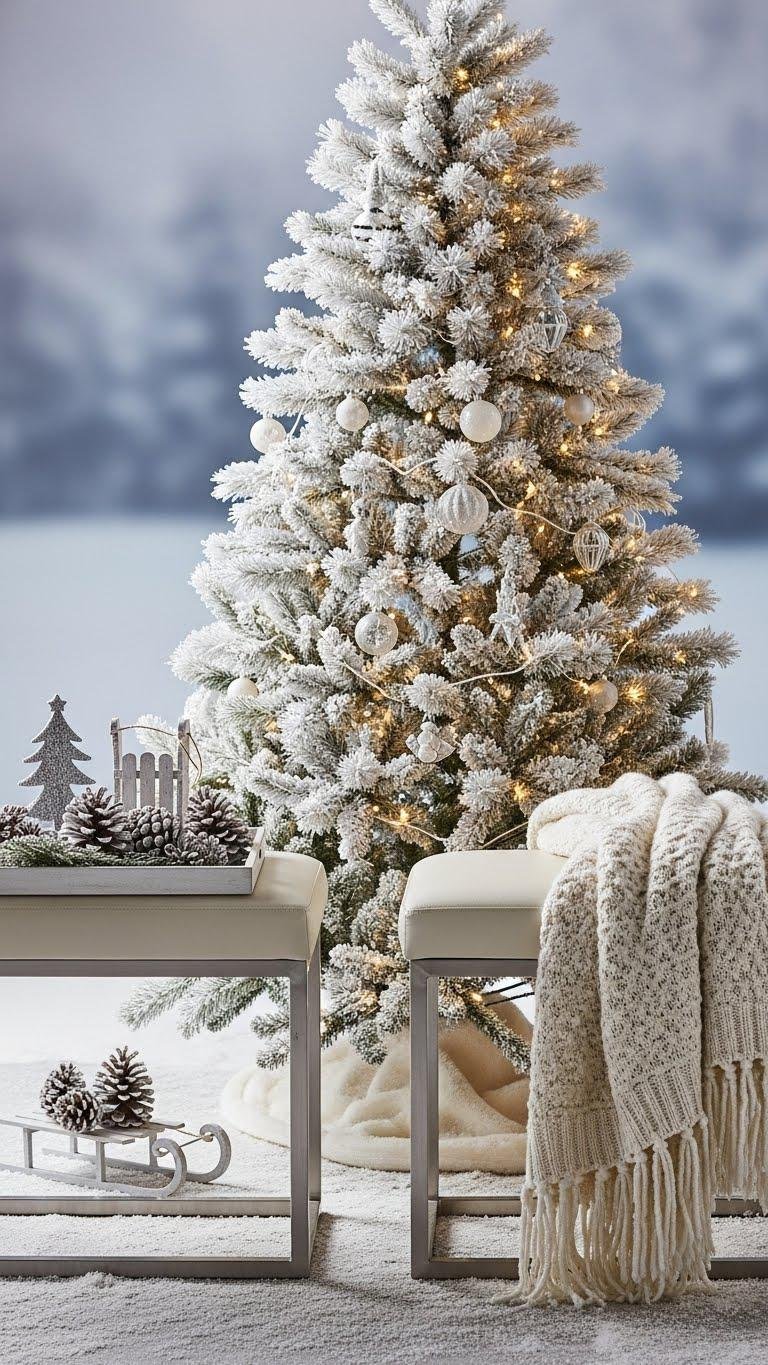 A snowy flocked tree between two slim benches creates an instant, balanced entry that feels both festive and modern.