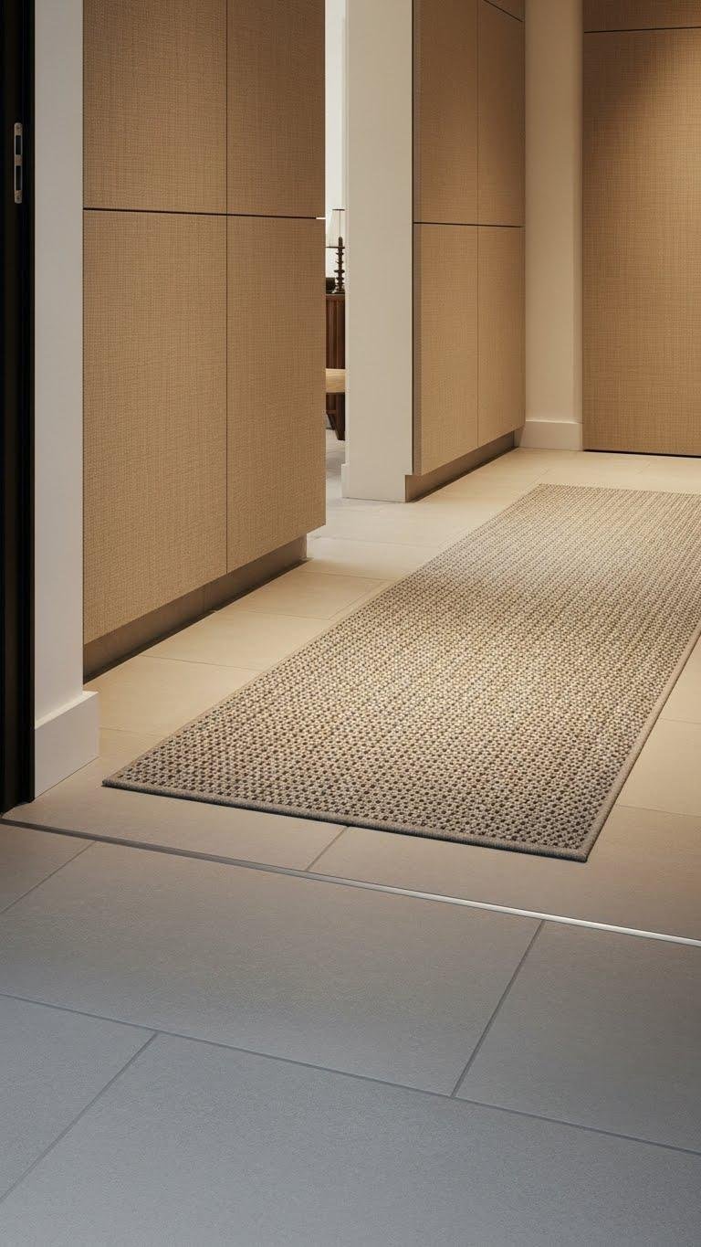 Pair those linen panels with a runner rug layered over tile to bring immediate warmth underfoot and visual continuity from door to interior. Choose a low-pile wool runner with muted patterning to hide traffic and anchor the space. Opt for a heated tilebacking option if cold floors bother you.