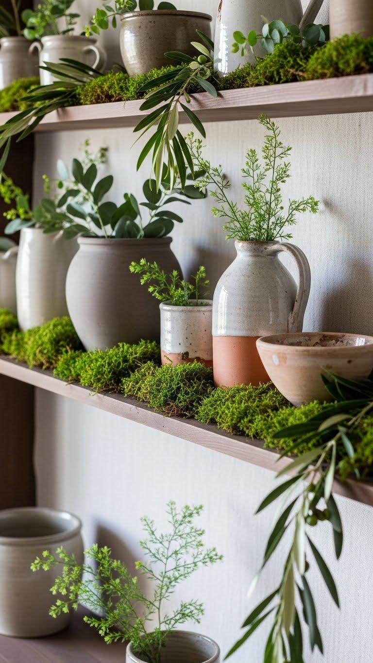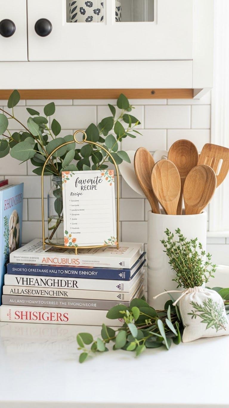 On your kitchen counter or open shelf, a stack of well-loved cookbooks paired with a simple utensil holder becomes a fresh, functional vignette when you tuck in sprigs of greenery. You’ll slide a favorite recipe card between volumes, nest an herb sachet alongside wooden spoons, and let eucalyptus or thyme breathe life into the space—effortless, free, and quietly stylish.