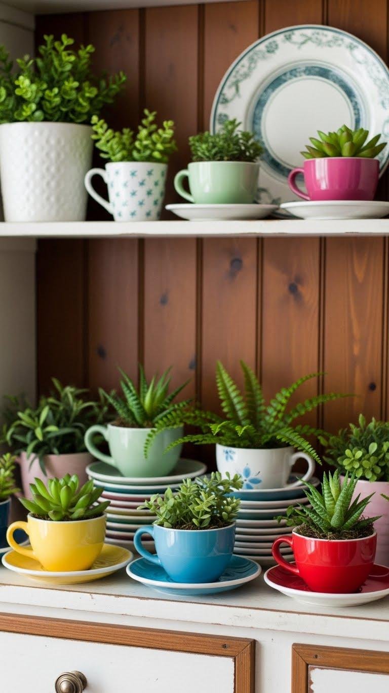 After you let fresh greenery breathe on the hutch, bring that same easy spring energy to unexpected spots with tiny faux plants tucked into mismatched coffee cups. You’ll mix Mini succulents and tiny ferns in vintage china, creating playful Espresso planters that free you to rearrange daily. These pocket-sized accents add charm without commitment, perfect for a laid-back, stylish farmhouse refresh.