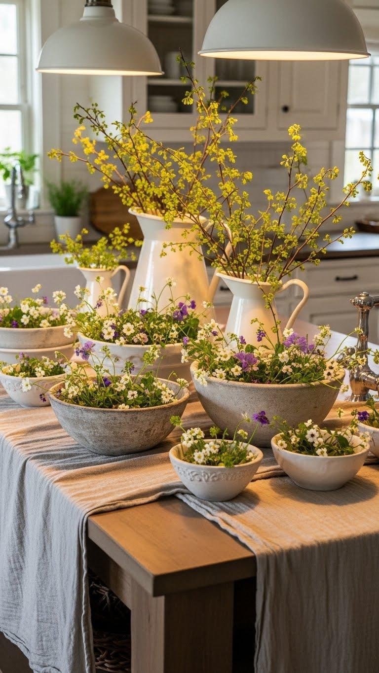 Bring a relaxed, lived-in charm to your kitchen island by grouping rustic floral bowls that mix weathered textures with cottage-style blooms. You’ll layer bowls in varying sizes, tuck in wildflowers and sprigs, and balance them with painted pitchers for height.