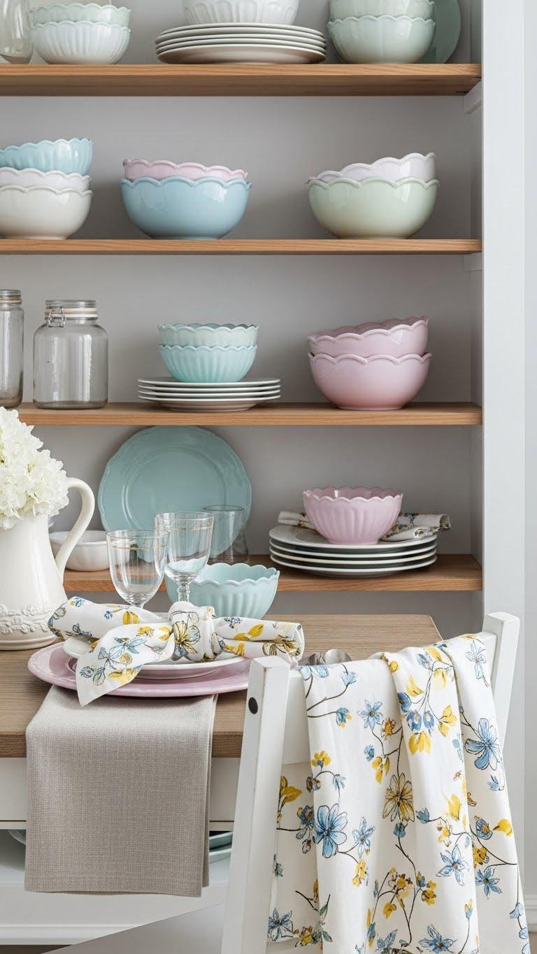 Set scalloped bowls out as instant focal points on open shelving or a breakfast table to add soft, vintage charm to your spring styling. You’ll pair them with neutral linen napkins and crisp dish towels tied casually for lived-in ease. Mix in painted chargers beneath bowls for subtle contrast, and drape a patterned dish towel over a chair to invite relaxed, free-spirited gatherings.